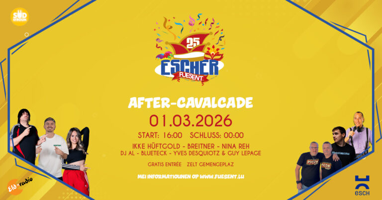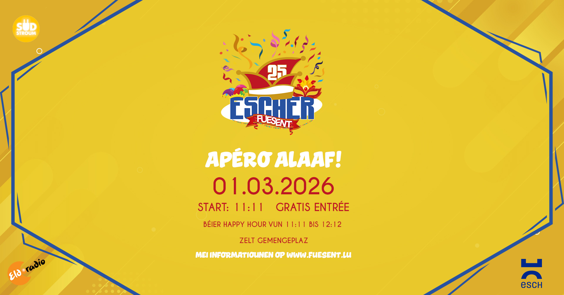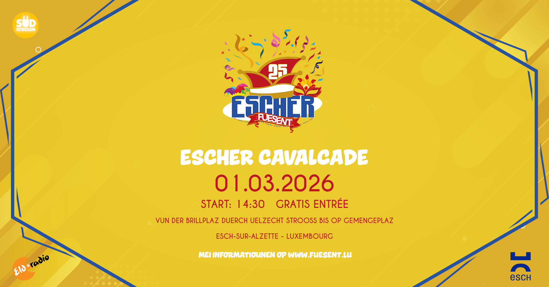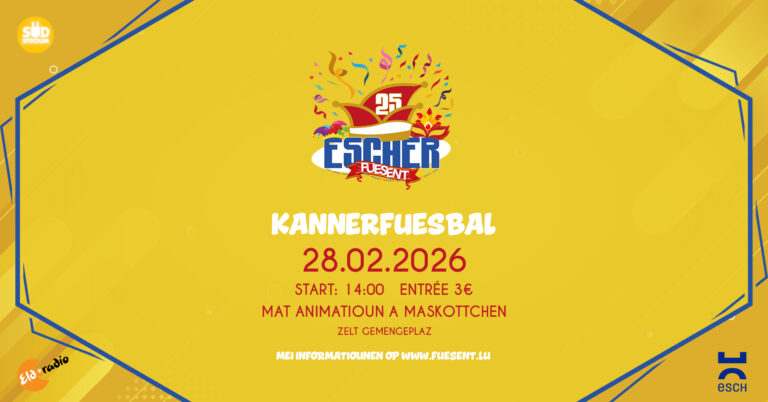25 JOER ESCHER FUESENT 28. FEBRUAR - 01. MäERZ 2026 SAVE THE DATE PROGRAMM 2026 Entrée 3€ - Dageskeess ENTRÉE 5€ - Ticketshop (Gläich) GRATIS ENTRÉE GRATIS ENTRÉE GRATIS ENTRÉE AFTERMOVIES 2025 FOLLOW US Instagram Tiktok Facebook Haaptsponsoren Sponsoren